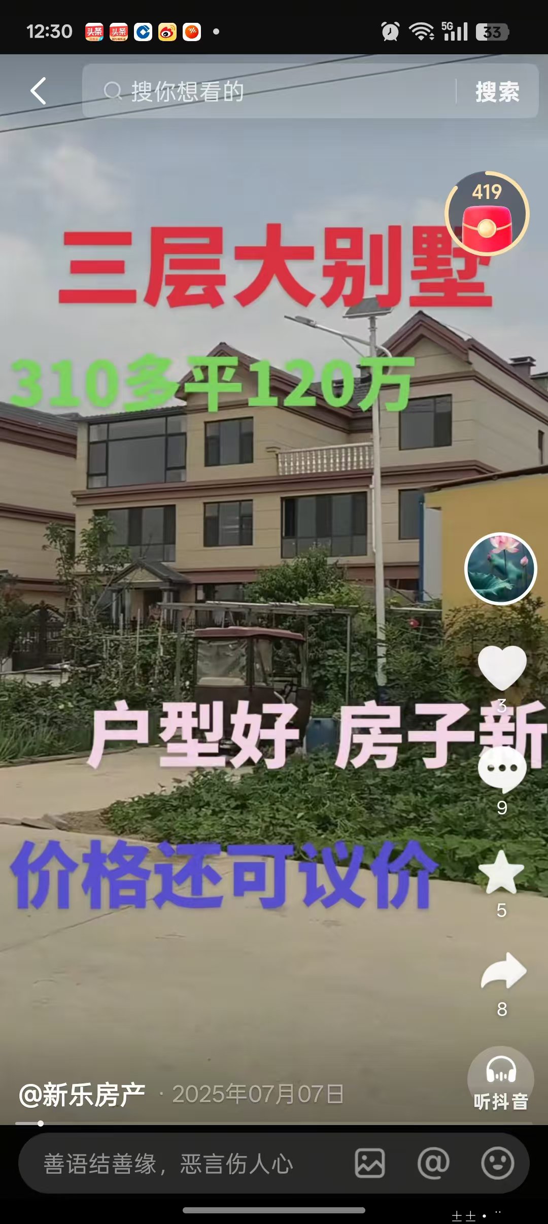 但黄家庄村的别墅项目却完全游离于监管之外:抖音平台2025年7月7日公开视频显示,当地一栋300多平米的毛坯三层别墅,户型按商品别墅标准设计,中介明确标注:是新民居、村证、报价一百多万元,价格可议。这种明显以销售为目的的别墅开发,既不符合宅基地“自住”的核心属性,也未取得建设用地规划许可,难道不属于典型的双重违规?
