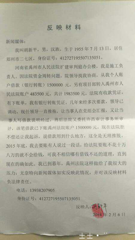 媒体了解到,居住郑州市二七区的胡新平在河南省禹州市人民法院扩建审判庭办公楼的过程中,胡新平是施工负责人。因法院资金周转问题,院领导找胡新平协商,从其个人账户借款(银行转账)1500000元,另有项目部转入禹州市人民法院账户483500元,共计1983500元,法院有收款凭证,有下账单,和银行转账凭证。几年来胡新平多次到法院要款,但领导已调动,现任领导一直推拖,让当事人在党组会汇报,又让当事人写借款说明经过,再后法院又委托许昌审计事务所审计,该笔借款已下账禹州法院账户1500000元,结果是现在法院拒不偿还让胡新平起诉,并让胡新平说借款用到什么地方等等无理的理由和推圈。2015年底,胡新平去要账,法院某领导说,给法院要账不花十万八万的就不会给钱,可胡新平不相信哪有借钱不还的道理,但事实是法院一直没有还款。