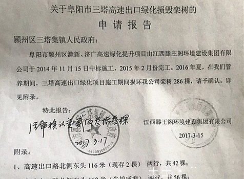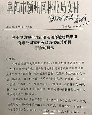 直到2017年,颍州区林业局方才给予验收,在滕王阁公司提供的一份《园林绿化工程竣工验收报告》中,记者注意到,该报告的开工时间为2014年12月18日,竣工验收一栏均为空白,在验收结论一栏中涉及多部门盖章签字时间均是空白。认定的合格总株数为9154棵。