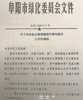 对此,2017年4月27日,阜阳市绿化委员专门发布了一份《关于高速公路两侧进行绿化提升的通知》,提到树木死亡的主要原因是两点:冬天气温突降,导致部分栾树死亡;部分路段没进行土地流转,权属不清等造成。