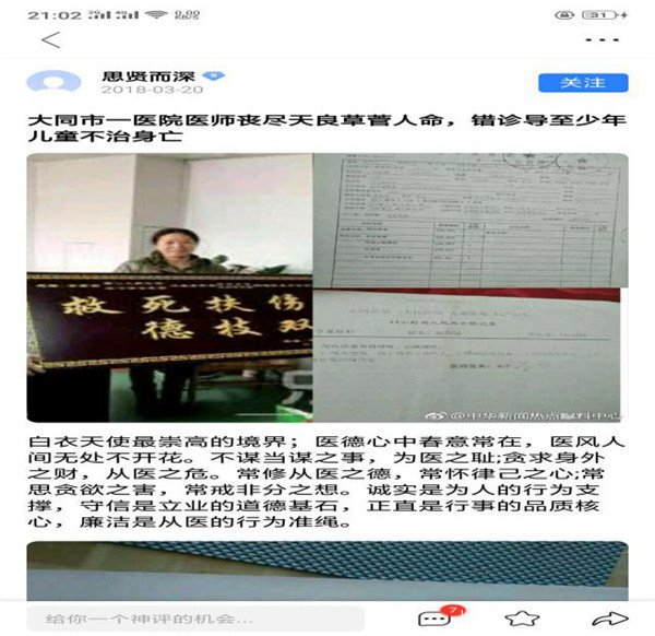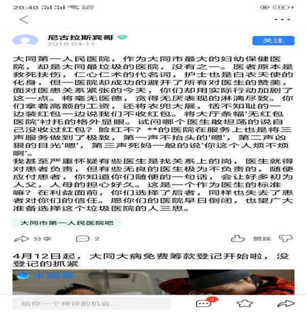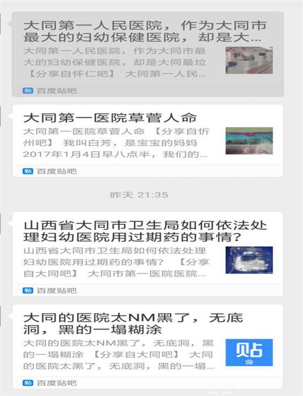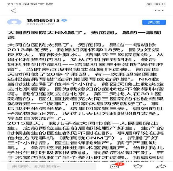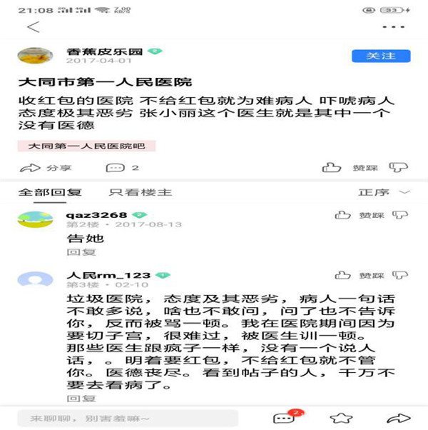 以上10张图片来自与网络截图,涵盖了2016年至2019年近年来些许患者对大同市第一人民医院的部分认知与评论,大多数都是针对医生工作态度与作风,其中不乏语气看是其医院内部职工的吐糟!