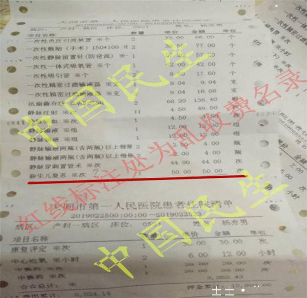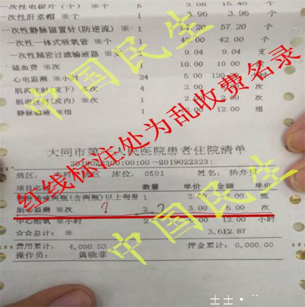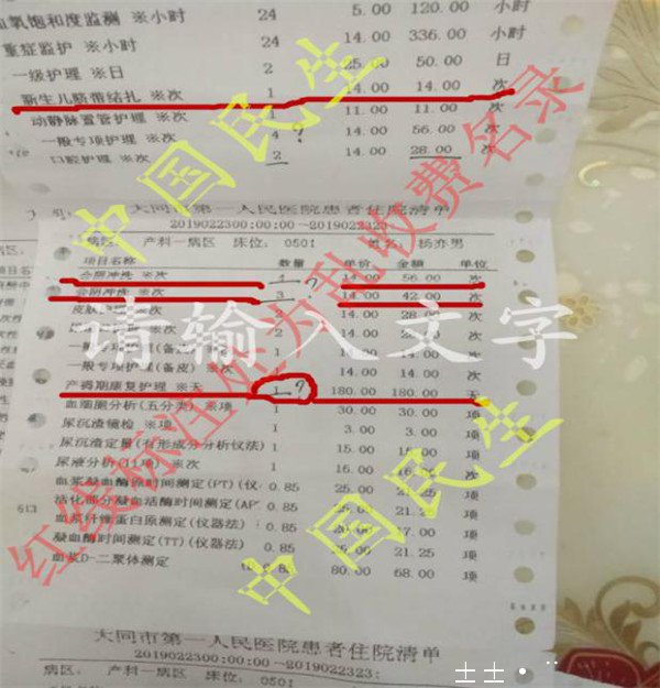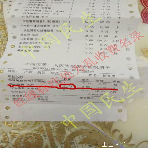 针对当事人的举报,编者还得知,在住院期间,大同市第一人民医院还存在几种乱收费现象,一是胎心监测费用两次6元、新生儿复苏费50元,当时已经检查出为死胎,为何还存在这些费用?并且在出院记录里写着胎心143次/分?难道对死婴做心脏复苏吗?二是口腔护理,没有做过任何护理,收费单子有做了两次28元,患者问护士长原因,答复居然是:我们每天提醒你清理口腔,这就是对你的口腔护理;三是会阴部清洗费用共计了7次,手术后病床上一共做过3次清洗;四是产褥期护理每天180元;五是脐带结扎一次14元。手术后病床上一共做过3次清洗,患者问护士长为什么多计算了4次,答复是可能是手术时给清洗了,当继续质问总共半小时长的剖宫产手术,清洗会阴4次这能说通吗?护士长的答复是这个我也不清楚,你们得问手术那边。这只是患者在住院单子上能看懂的,看不懂的就不知道了。