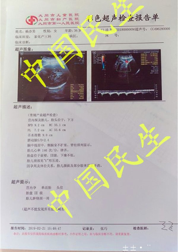 我是杨女士,今年37岁,生育过一个女孩。2018年6月1日最后一次月经来潮,58天后,我第一次就诊大同市第一人民医院产科门诊,结果均为正常。2018年11月29日也就是孕期第24周零三天,第二次来到大同市第一人民医院,这次结果仍均为正常。