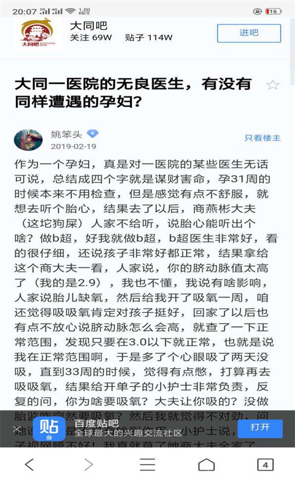 近日,有群众实名举报称:2019年2月21日下午3点多,当事人在去大同市第一人民医院做最后一次晚孕产检时,由于孩子胎心不好,大夫又涉嫌失职,拒绝与孕者交流,没有尽责说出事情的严重后果,导致孕妇足月38周的胎儿因胎心不好没能及时抢救,临盆婴孩变成了死胎。此外,在该医院住院期间,还出现多种乱收费现象,大同市非常有名气的已经有百年历史的大同第一人民医院,出现这种问题,实在让人难以释怀。