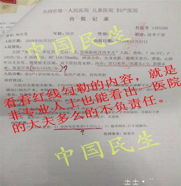 大同市第一人民医院属于现代化三级乙等医院,这么大医院的内部管理以及大夫素质为何如此之差,是什么导致的管理这么混乱,又是哪种管理方式,让这里的大夫这么胆大,挣着医院的工资,吃着外面药店的回扣?反问,这外面药店的药难道真能治病,对症下药?还是另有隐情?医者原本是救死扶伤,仁心仁术的,可为何这些白衣天使毫无医德,不负责任,贪得无厌,至患者生命与不顾?十月怀胎不易,当事人年龄已大,又是二胎,足月的男婴,以后有没有机会顺利怀孕生产都是问号,前期付出的心血,手术剖腹的疼痛,心里永远的伤疤,谁去安慰,谁能理解,谁去负责?