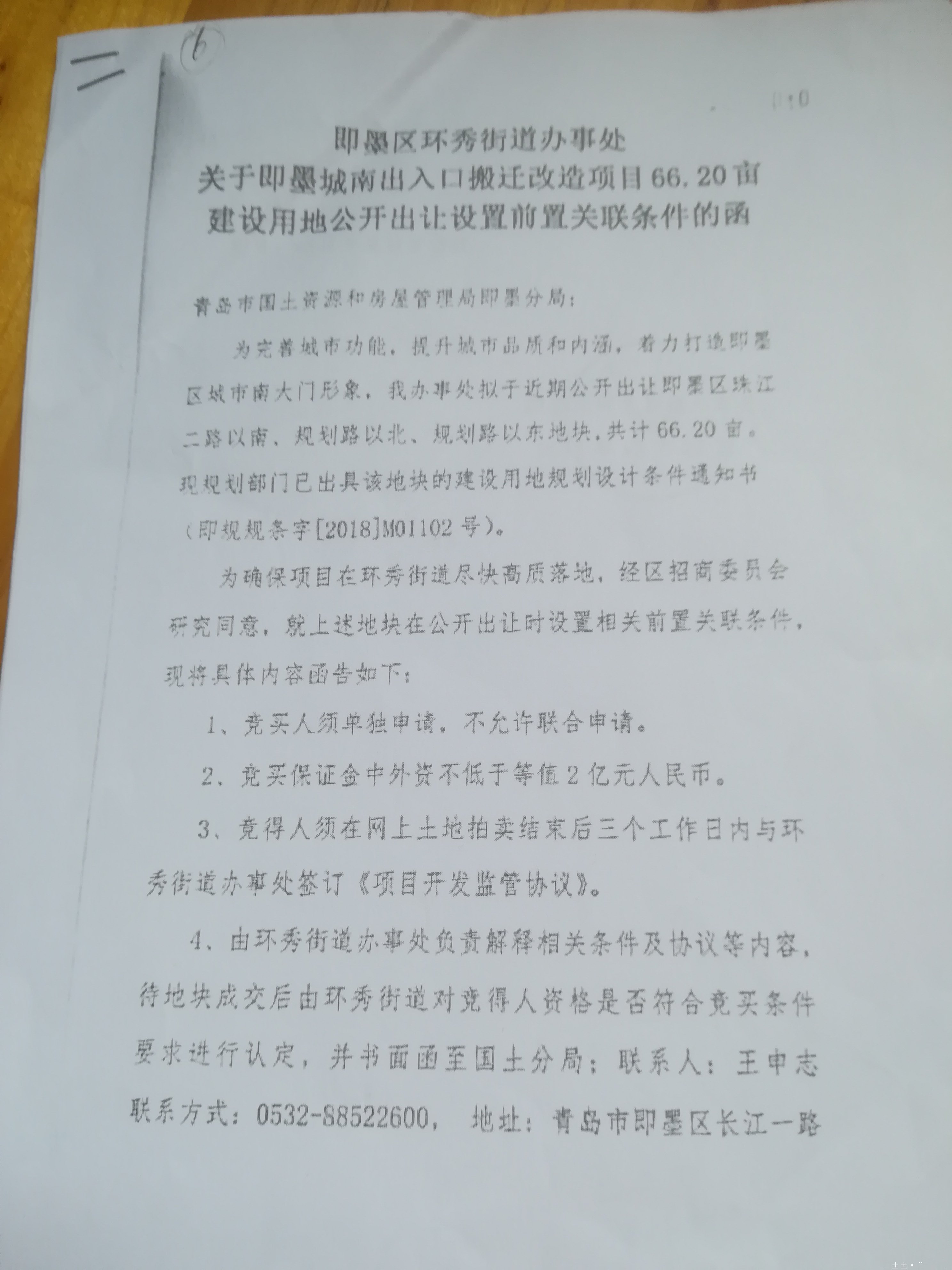 记者注意到,环秀街道办事处在这封函中提出的前置关联条件,作为土地招拍挂主体的即墨资源局已经照搬到了出让公告和出让须知里。