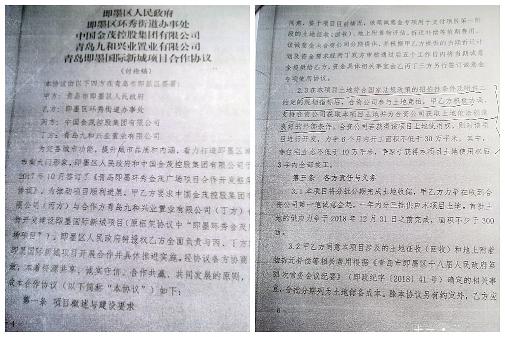 他们出示了一份由即墨区政府、环秀街道办事处、中国金茂控股集团有限公司(以下简称金茂集团)、青岛九合兴业置业有限公司(以下简称九合公司)四方秘密达成的《青岛即墨国际新城项目合作协议》(以下简称四方协议)。