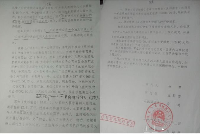 “2019年2月25日,林西县法院依法适用简易程序对该案件进行了公开开庭审理,因为天一公司律师在庭审前向法庭提交反诉状(并没有向法庭提交出来双方签订土地承包合同的有效证据,即:土地承包合同书原件与复印件。也没有缴诉讼费用),法院要给我举证时间,当天庭没有开成。2019年4月10日,法院依法就此案件适用普通程序公开开庭进行了审理,因为依职权,法庭要追加金源公司为本案件的被告参加诉讼,法庭对于我交上去的所有证据包括影像视频材料,并没有当庭全部宣读、对证、质证、印证和播放完毕音频、视频、录像资料,便草草了事闭庭。2019年7月3日,林西县法院第三次就此案件依法进行了公开开庭审理。在法庭上,作为被告的甲方始终没有提交出来他们与我签订承包土地的合同来。因为他们根本就没有合同可以提供。他们与村民王玉琛等人之间的土地承包关系,也不存在双方签订有书面土地承包合同的事实,都是口头君子约定的协议。面对我所提交所种土地全部过程齐全的录音、录像、人证、物证、(包括法院李国彬带法警的录音、录像)等无法抵赖的事实依据、证据,天一公司均当庭予以承认,需要进行庭外调查取证补充的证据材料及其它事实真相,他们则矢口否认。更为奇怪的是,对于我当庭多次提出来要求传唤那些与案件有关联的主要当事人及重要证人到庭作证(如:天一矿长张国军、会计李志民、村民王玉琛等),或对相关证据材料进行庭外调查取证补充的合理诉讼请求,却屡次被法庭以所提证人与本案无关,或系案外人员为由,遭到法庭的拒绝。审判长马玉竟然当庭称我于海飞所提交的证据是法律上不予认同的无效证据,这些证据不是他们法律上所需要的证据。2019年5月23日,内蒙古自治区林西县法院不顾上述已经存在的客观事实,一审便以(2019)内0424民初293号民事判决书,违背案件事实,枉法做出不负责任的判决,2019年7月3号开庭,发给我的却是5月23日下的判决书。并驳回我的所有诉讼请求。对如此显失公平、公正的判决结果,我当然是不会服了,在接到一审法院判决书以后的第一时间里,我遂就此案件上诉至赤峰市中级人民法院,诉讼请求同样是被驳回。”于海飞继续不停的地向我们诉讼着该案件在审理过程中所出现的众多瑕疵与不公正不公平的地方。