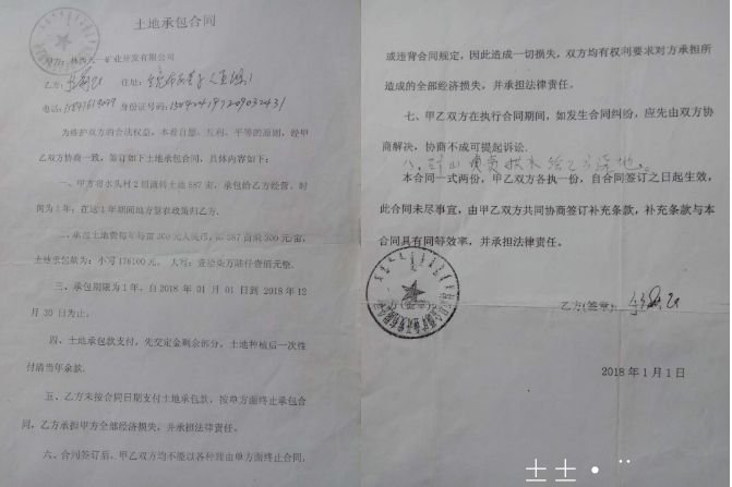 “6月9号,因为缴土地保险金需要看合同,我和王玉琛一起去天一公司要了一份承包土地的证明,对方当时拿出来一份落款时间是2018年1月1日已经签订好(拟好了)的土地承包合同让我在上面签字,我看这份合同的内容与我当初与矿山领导人一开始口头所谈的内容严重不符,出入也太大了,便要求与天一公司重新签订一个书面土地承包合同协议,顺便再把我们口头协议好的内容也一起写进去,当时对方也答应了我的要求,他们让我和王玉琛先去村里缴土地保险金,其它事情等回来后再说。因为急于缴土地保险金,当时,我们也没有考虑那么多,就相信了他们的所说,我就先在只盖有公章没有对方法人签字的土地承包合同书上面签了字。等我们缴完土地保险金以后,天一公司突然给我来了一个大变脸,并且多次派员向我索要原来给我们用来缴保险金证明的土地承包合同,我没有答应他们的要求。索要不成,他们就硬逼着我跟他们再补签一份内容和我手里一模一样,落款时间是2018年1月1日明显带有欺诈胁迫行为的土地承包合同,我又不是傻子,这个我当然是不会同意了。因为我是3月20日和村民王玉琛才去看的承包土地,在后来的法院审理案件过程中,金源公司、天一公司及王玉琛也都认同了我这个说法。在看完承包土地后的4月17日我才上缴的土地承包押金,押金当时是由天一公司财务人员李志民签收,收条上面写的收款人是矿长张国军名字,有收据、日期证明的。而他们这个合同和我签订的时间却是2018年1月1日的,与我承包土地时间毫无关系,况且合同上面盖的只是两个公司的公章,并没有公司具体负责人(法人)签字,我怀疑他们从头到尾这就是在精心设计一个骗局让我往里面钻。我们都是实实在在的普通农民,全家也是靠举债种田过日子的人,我们可是把一生的精力都投在该土地上了,出现这种情况,他们真的是想要我们的命呀!”。村民于海飞愤怒的向我们倾诉着他承包土地以来的不幸遭遇。