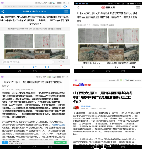 1 月中旬,记者经过调查、了解、取证后追踪采访了太原市人大信访局张局长,张局长 经过几个工作日后把举报材料下发到小店区政府。随即也采访了小店区纪检监察委霍存柱书 记、坞城街道办常世俊主任、坞城街道办负责坞城村拆迁的王建伟主任,最终没有得出相关 部门公平、公正、公开的调查结果。
