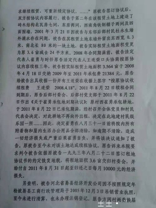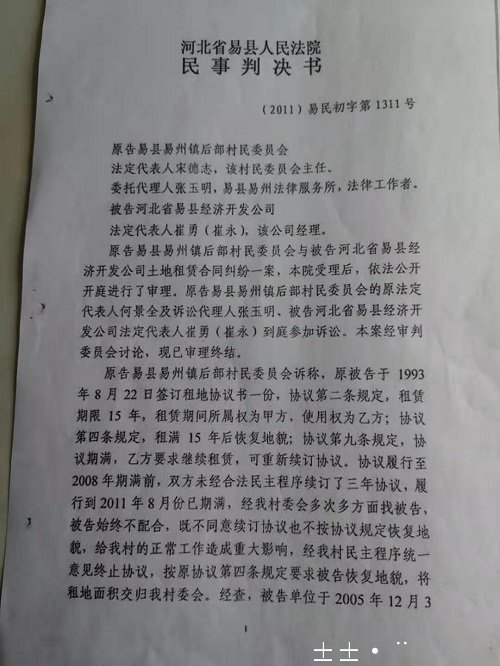另外,村民还提到后部村民委员会起诉河北省易县经济开发公司返还该村土地一事。易县人民法院于2013年7月8日,判决如下:1.限被告河北省易县经济开发公司于本判决生效之日起十日内恢复地貌,并返还后部村3.564亩土地。2.限被告河北省易县经济开发公司于本判决生效之日起十日内按每亩每年2000元的标准,给付原告后部村委员会自2011年8月31日起至交还土地之日的经济损失。3.驳回原告的其他诉讼请求。