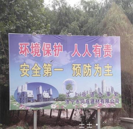 然而,在商混站不远处的主干道旁,耸立的一个大广告牌格外醒目,“环境保护,人人有责。安全第一,预防为主。”落款竟然是“汶上街道办事处 济宁市同成建材有限公司”。由此可见,该商混企业和街道关系非同一般。更为讽刺的是,环保有问题不去整改,只是落实在户外广告上空喊口号而已。