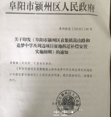 2018年,阜阳市颍州区人民政府下发关于印发《阜阳市颍州区袁集镇嵩山路和追梦中学及周边项目征迁补偿安置实施细则》的通知。