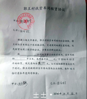 据田春海提供的一份袁集镇《郭王村扶贫车间租赁协议》显示,“根据上级文件要求,郭王村扶贫车间面向社会招租,优先租赁与用工较多的企业,方便本村群众就业”,并约定承租时间及缴纳了相应的意向金1万元,并与颍州区袁集镇郭王村村委会签订了上述协议,并约定一年10万元租金,并盖有红章确认。