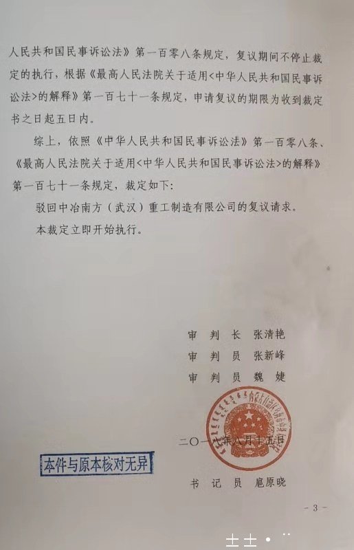 然而,2019年8月23日,中冶南方武汉制造收到乌海市中级人民法院的(2019)内03民初42-2号裁定书,驳回他们的复议请求。令人哭笑不得的是,该裁定书落款日期竟是2018年8月15日,这样有着重大错误的裁定书竟然对央企下达了。