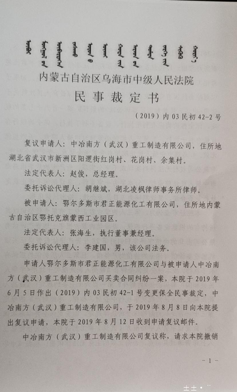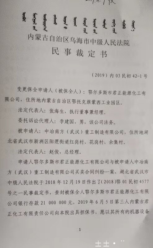 内蒙古8月30日电(张杰 刘志武)2019年6月6日,内蒙古自治区乌海市中级人民法院下达了(2019)内03民初42-1号民事裁定书,裁定查封、冻结担保人内蒙古君正化工有限责任公司炭材烘干窑尾除尘三套、筛分楼除尘设备二套、配料站除尘系统设备二套、炉顶加料系统除尘二套、炉体砌筑打结材料四套、变压器系统二十四套、净化设备四套、电极柱十二套,并解除对被保全人鄂尔多斯市君正能源化工有限公司(简称鄂尔多斯君正)银行存款2100万元。消息传开,被申请人央企中冶南方(武汉)重工制造有限公司(简称中冶南方武汉制造)立即申请复议,并举报了此案的三名办案法官,引起了舆情的极大关注……