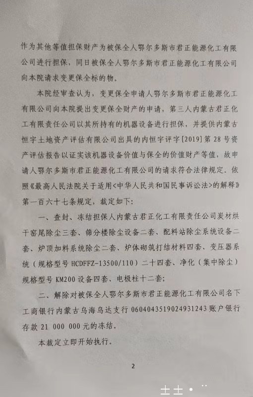 2018年11月1日,武汉市中级人民法院立案,并根据中冶南方武汉制造诉讼保全申请,依法于2018年11月19日下达了(2018)鄂01民初4577号民事裁定书,查封、冻结鄂尔多斯君正的银行存款2100万元。