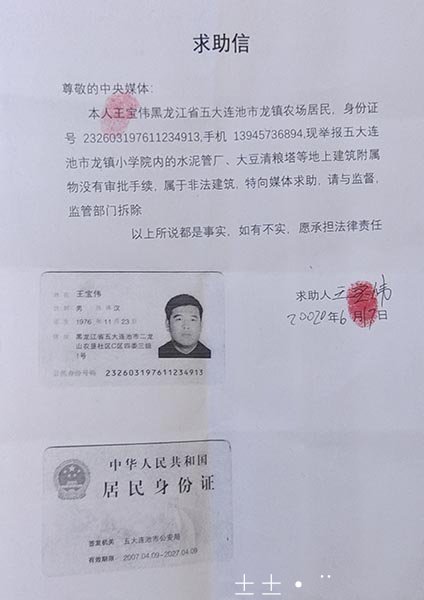 2020年6月17日,收到了黑龙江省五大连池市龙镇农场居民王宝伟的求助信,请本网配合他向相关的部门反映,龙镇小学院内水泥管厂,地上建筑附属物属于拆违建筑,由于哈尔滨出现了疫情原因,去外地需要被集中隔离的,经过查看相关的公告和电话咨询五大连池市疫情防控指挥部,被告知只要是绿码配合当地查验身份证,测体温就可以通行,监督员是6月17日上午10:00到达了五大连池市龙镇政府的卡口,见到停放的警车和身穿防护服的工作人员,要求扫行程码,测体温,正常通过了。一上午的时间多次往返卡口,都正常通行也没有受到任何阻拦。