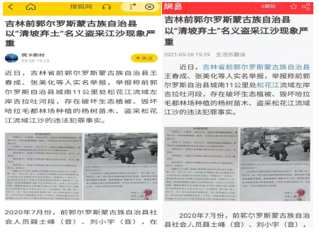 近日,吉林省前郭尔罗斯蒙古族自治县聂世峰(音)、刘小宇(音)以“清坡弃土”名义盗采江沙的问题被多家媒体报道,时至今日,前郭尔罗斯蒙古族自治县(以下简称前郭县)的相关部门均未向社会与公众公布调查结果。