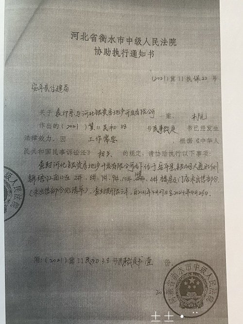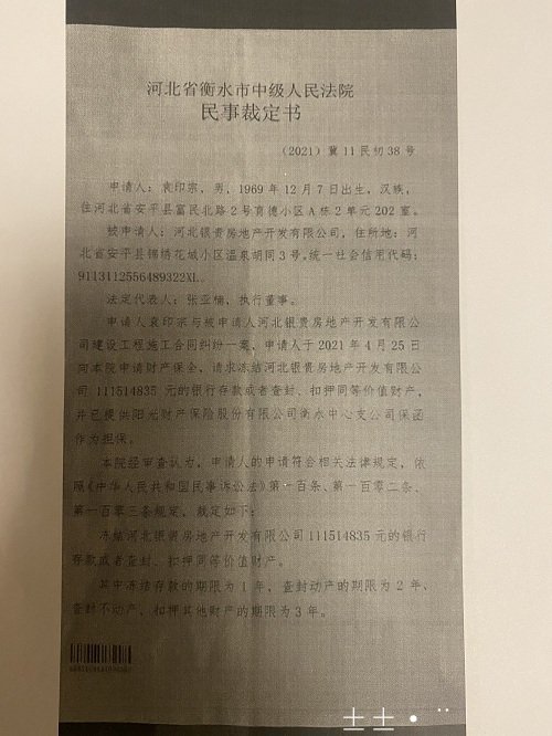 张贵波说,立案庭、执行庭、主审业务庭,他们多次到衡水市中级人民法院询问,才得知是由于与袁印宗的建设工程施工合同纠纷案,法院在2021年4月25日做出了诉讼保全《民事裁定书》【(2021)冀11民初38号】,并交付立即执行。
