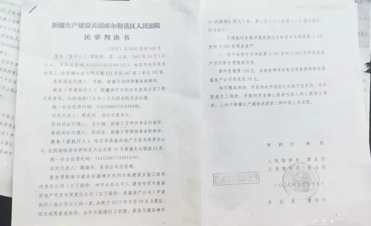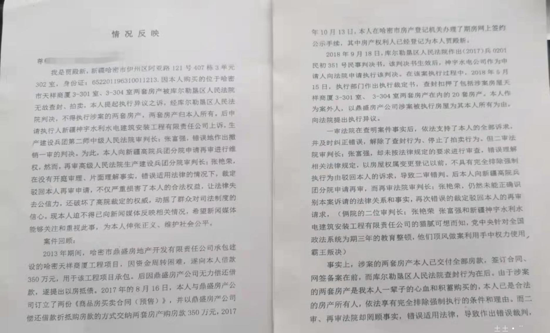 我是贾殿新,因本人购买的位于哈密市天祥商厦3-301室、3-304室两套房产被法院无故查封、拍卖,本人提起执行异议之诉,经法院判决,不得执行涉案的两套房产,两套房产归本人所有。后申请执行人新疆神宇水利水电建筑安装工程有限责任公司上诉,中级人民法院,错误地作出撤销一审的判决。为此,本人向分院申请再审进行维权,然而,在没有开庭审理、片面理解事实,错误适用法律的情况下,裁定驳回本人再审申请,不仅严重损害了本人的合法权益,让法律失去公信力,还破坏了高院裁定的权威,动摇了群众对司法制度的信心。现本人迫不得已向新闻媒体反映相关情况,希望新闻媒体能够关注和重视此事,为本人伸张正义、维护社会公平。