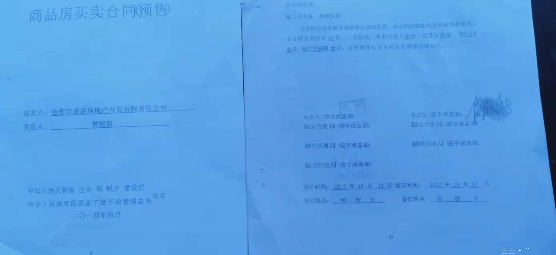 2013年期间,哈密市鼎盛房地产开发有限责任公司承包建设的哈密天祥商厦工程项目,因资金周转困难,遂向本人借款350万元,用于该工程项目承包。后因鼎盛房产公司无力偿还借款,遂提出以房抵债。2017年的8月16日,本人与鼎盛房产公司订立了两份《商品房买卖合同(预售)》,并以鼎盛房产公司偿还借款折抵购房款的方式交纳两套房产购房款350万元,2017年10月13日,本人在哈密市房产登记机关办理了期房网上签约公示手续,其中房产权利人已经登记为本人贾殿新。