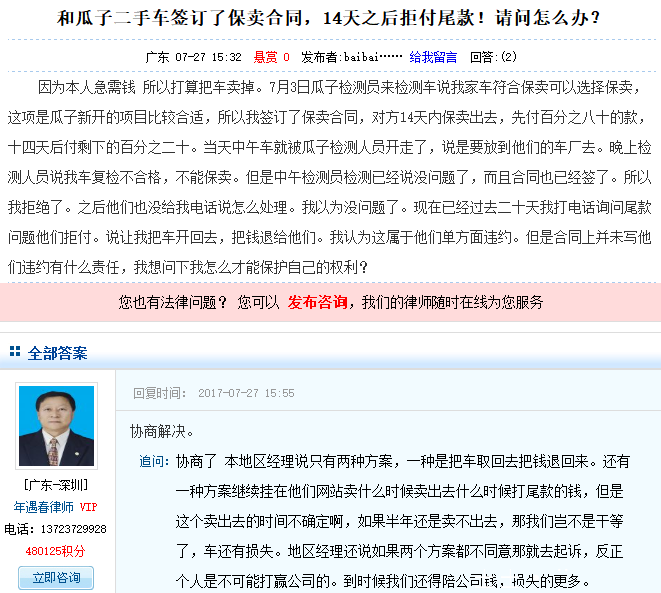 无独有偶,后来在网上查到泉州广播电视台一则新闻:“在瓜子二手车上卖车,尾款竟被卷走!20多人都遭遇这事!”这也是一件售中发生的事。市民梁先生通过瓜子二手车平台卖了一部车,可是快两个月过去了,尾款还没收到,他打听后得知,还有多名车主和他有同样的遭遇。