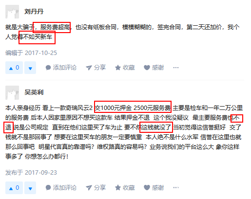 知乎用户赵越曾经写道:“千万不能在瓜子上买车,我刚刚在一个月前买了一台车,现在出问题了没人出来解决。我买的是18万的车,交了5.4万元首付,公司信贷员给你做了一个他家公司内部的贷款,全车下来我多还了他家公司4万多。为了这个事我找了几次,没人解决。说合同你自己签的,和他家工作人员没有关系,而且都是电子合同,根本不让你阅读,就是发个验证码,然后让你填上,这就落入圈套了。然后我们第一期就拒绝还款,这时候瓜子网就找来黑社会的把车开走了。开走了不要紧,开车的那些人开着我的车出去抢劫了,对方报案了。一看东窗事发了,瓜子网上的人没有一个出来管事了,打一个电话说决绝不了.没遇到过这种事,打一个还是这样的回答。所以请朋友们不要再这里买车了,太害人了,挣得都是黑心钱。”