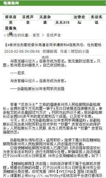 除此之外,一名自称是“孙副检察长32年老同学洪志强”的人,在网上以《泉州住别墅检察长再遭老同学爆新料》为题,曝出“住别墅检察长充当‘校霸’贪官的保护伞”问题。