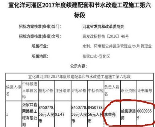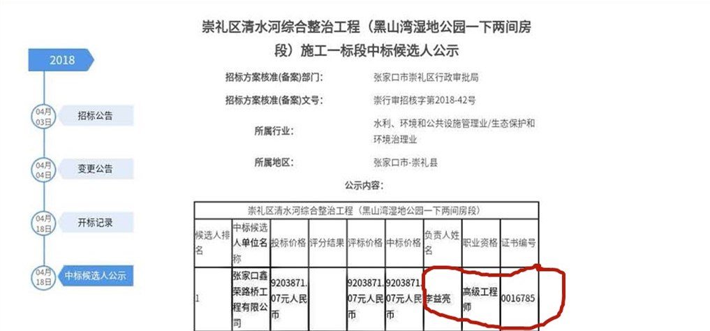 一:2018年4月3日张家口市崇礼区水务局发布崇礼区清水河综合整治工程(黑山湾湿地公园---下两间房段)公告,随后公布施工一标段中标候选人为: