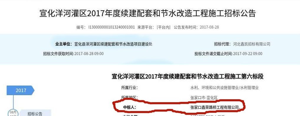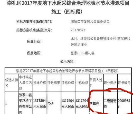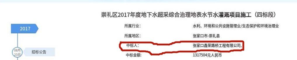 二:2017年8月23日张家口市崇礼区水务局公告崇礼区2017年度地下水超采综合地表水节水灌溉项目施工(四标段)及中标候选人公示、中标结果如下: