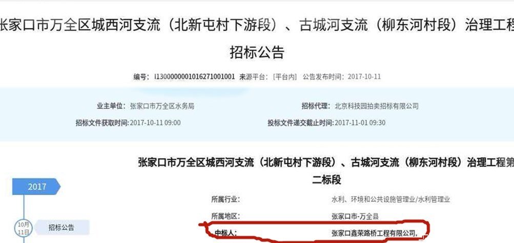 三:2017年10月11日张家口市万全区水务局公告张家口万全区城西河支流(北新屯下游段)、古城河支流(柳东河村段)治理工程二标段,及公示中标候选人、中标结果如下: