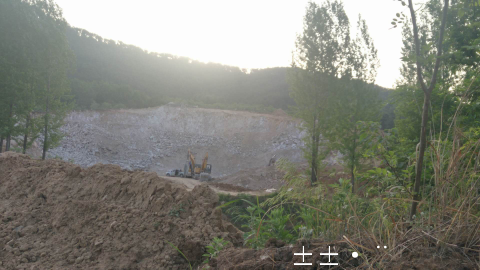 4日一早,记者再次来到现场,界牌处的石子厂还在生产当中,北侧的采石依旧进行,本是挂满碧绿植被的山坡,被挖出一个个千疮百孔的大坑,远远看去甚是扎眼。在庙东庄南,省道北侧的石子厂也同样在生产,现场的粉尘扬起几十米高,记者跟着拉石卡车,一路上尘土飞扬曲折进入了位于黄金山北侧的采石场。同样的碧绿山坡被挖了一个灰白色的大坑,宛若伤疤呈现眼前。两台挖掘机在现场,一台在采石,一台在装车。省道南侧的石子厂在早晨,停止了生产,现场负责人表示,如果政策允许,我们白天也会生产。而反映人说:这些石子厂均没有合法有效手续,都是违法生产。