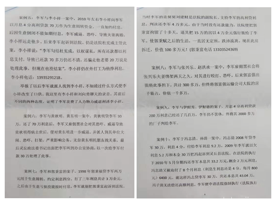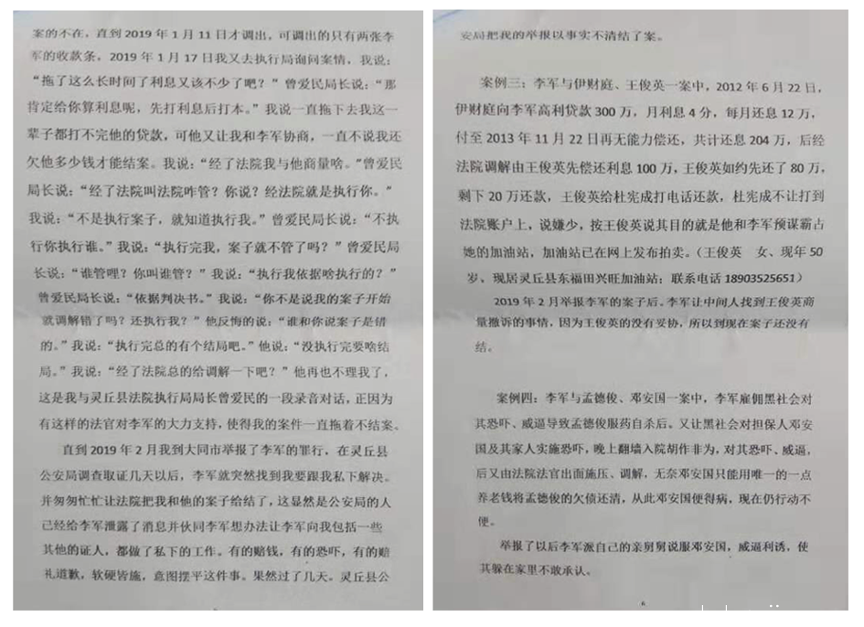 直到我2019年1月23日向大同市扫黑办举报灵丘县黑恶势力李军买通法官常年民间高利放贷欺压百姓牟取暴利,市扫黑办将举报材料转到县公安局,县公安局经侦支队着手办案,也不知道哪里走漏的消息让李军私下与在案人员提前沟通,让他们不要承认事实,我去邓安国家时就与李军的亲戚碰面,结果邓安国在我有录音的情况下也在材料中否认了李军的暴力催收行为。在灵丘县公安局调查取证几天以后,李军就突然找到我要跟我私下解决。并匆匆忙忙让法院把我和他的案子给结了,这显然是公安局的人已经给李军泄露了消息并伙同李军想办法让李军向我包括一些其他的证人,都做了私下的工作。有的赔钱,有的恐吓,有的赔礼道歉,软硬皆施,意图摆平这件事。果然过了几天。灵丘县公安局把我的举报以事实不清结了案。可见李军在灵丘树大根深绝非虚言,他常年涉嫌非法经营、组织打手与黑势力勾结暴力催收,对欠款人采用拘禁、殴打、恐吓、砸抢、威逼等手段,压榨民众,偷税漏税,牟取暴利的事实,一项都没得到解决,仍逍遥法外 (刘向勇,联系电话:1833497788)