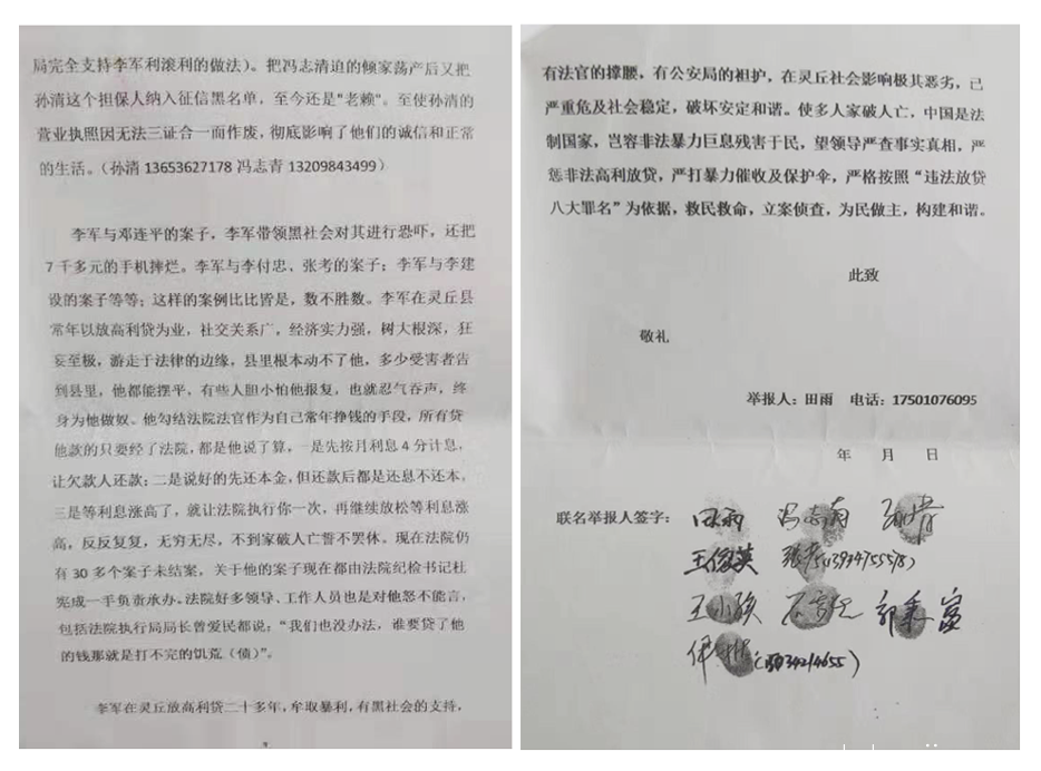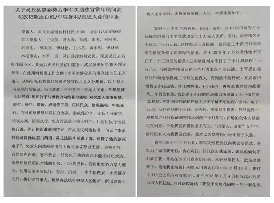 关于灵丘黑恶势力李军操纵高利放贷直逼人命的举报