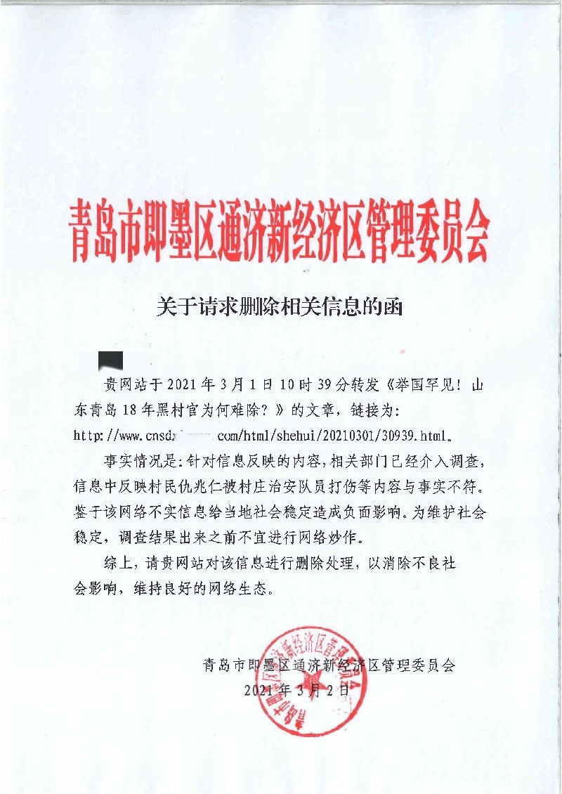 去年8月份以来,驻京新闻媒体就山东省青岛市即墨区涉黑村官仇兆兵及高价长期豢养武功打手"治安民兵组织"违法犯罪的种种劣行连续披露追踪。文章发表后,在国内各界引起强烈反响。面对舆论监督所涉及仇兆兵一伙铁证如山的重大涉黑事实,山东省各级部门机关却置若罔闻,更有甚者,青岛即墨政府还强烈抵制,向各媒体发函抵赖、责令删除文章。甚至公开叫阵文章作者,污称"内容事实全部捏造,给当事人造成了不良影响"且在"删稿函"中威胁"公安部门已经介入调查",暗示要抓捕文章作者。