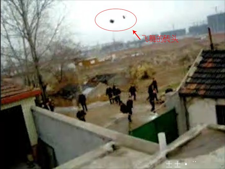 图三:仇兆兵、仇吉顺现场督战,指挥其豢养"治安民兵组织"向受害村民发起猛烈的"砖瓦石块"攻击,并入宅毒打伤害。