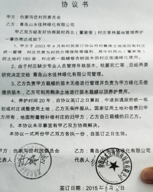 在此协议下,村内绿化建设向山水佳林公司依然提供绿化款400多万,仇兆兵利用该公司进行贪腐敛财,该协议是在村民举报多次之后,仇兆兵迫于压力私自倒签的假文件,都是为了掩饰仇兆兵个人破坏耕地、硬化路面的违法行为。