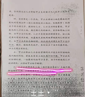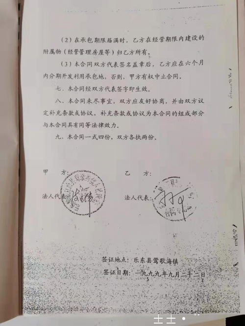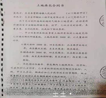 图:一九九九年九月二十二日,乐东县莺歌海镇人民政府与乐东金邦椰林工程开发有限公司签订土地发包合同,总面积五千亩。第六条约定:乙方在获得承包土地,土地只限种植椰林只用,不得随意改变土地使用性质。